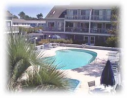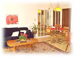 Komplett möbliertes Ferienhaus mit einem Schlafzimmer. Großer Balkon mit Blick auf den Swimmingpool. Schlafzimmer mit Doppelbett, Wohnraum mit Schlafcouch.